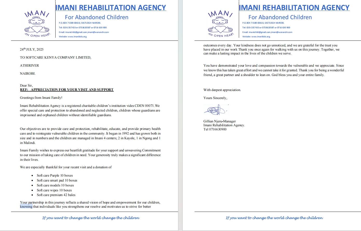 活動結束後,樂舒適肯亞團隊收到了來自 Imani 兒童之家的感謝信。機構負責人 Gillian Njeru 表示,此次合作體現了雙方給予孩子們希望與幫助的共同願景。正因有了樂舒適這樣盡心盡力的夥伴,他們更加堅定了信念,要繼續為孩子們的美好生活不懈努力。
