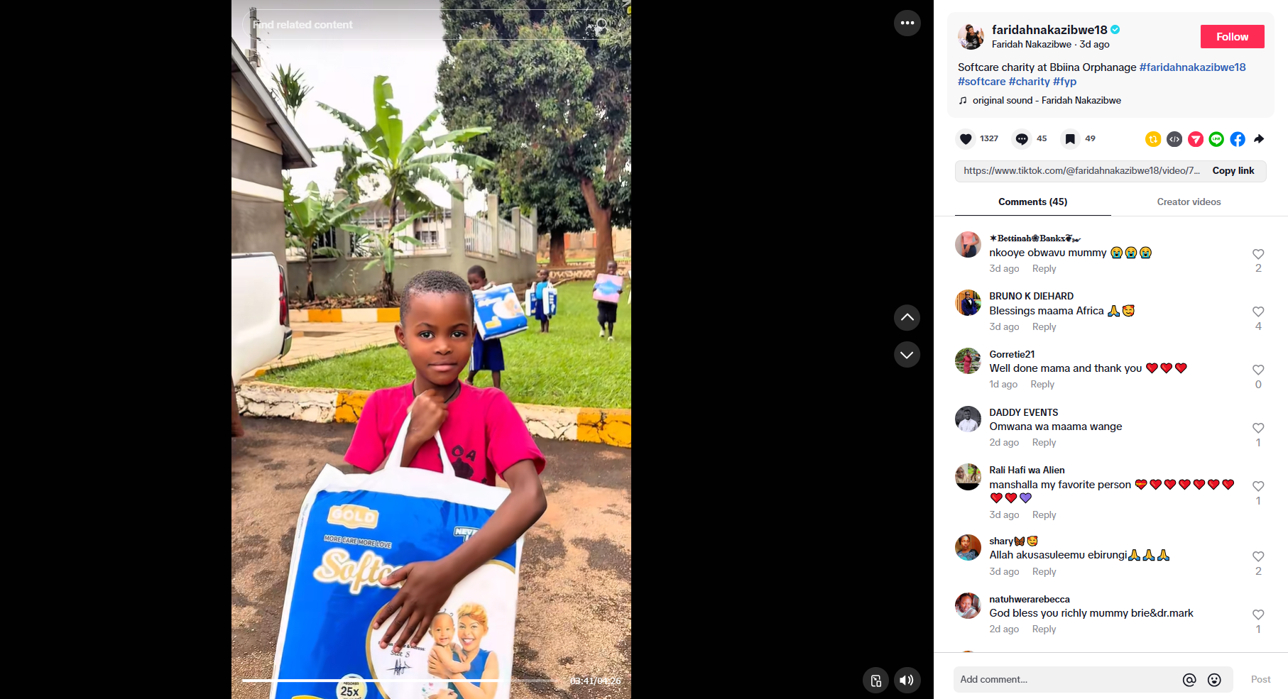 非洲之家孤兒院(Family of Africa Orphanage)由總部位於烏幹達坎帕拉(Kampala)的NGO組織-非洲之家烏幹達(Family of Africa-Uganda)營運。孤兒院致力於為當地弱勢兒童提供住所、教育和醫療服務。活動結束後,孤兒院代表對樂舒適烏幹達團隊和法裡達的到訪表示感謝,讚揚捐贈的物資極大保障了孩子的健康與尊嚴。